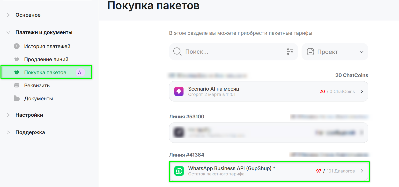 В списке отобразятся линии с подключёнными каналами WhatsApp Business API и остаток доступных диалогов по каждой линии.