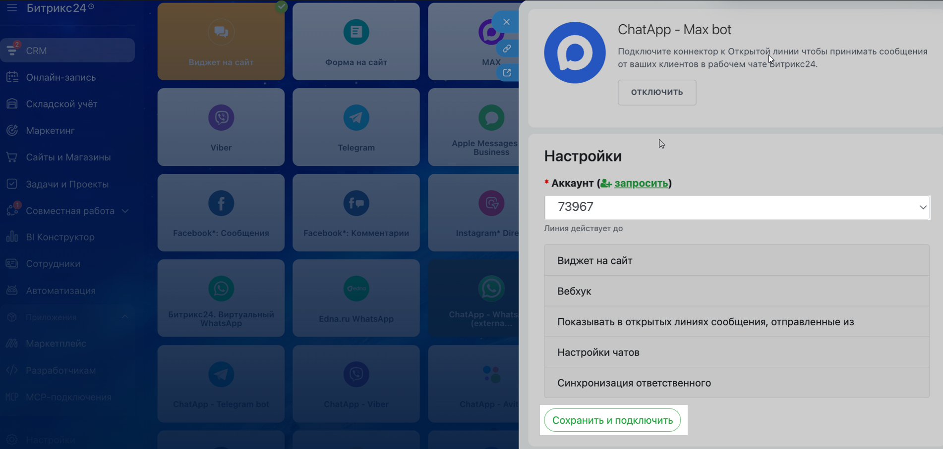 3. Нажмите «Сохранить и подключить». Готово — Max bot добавлен.