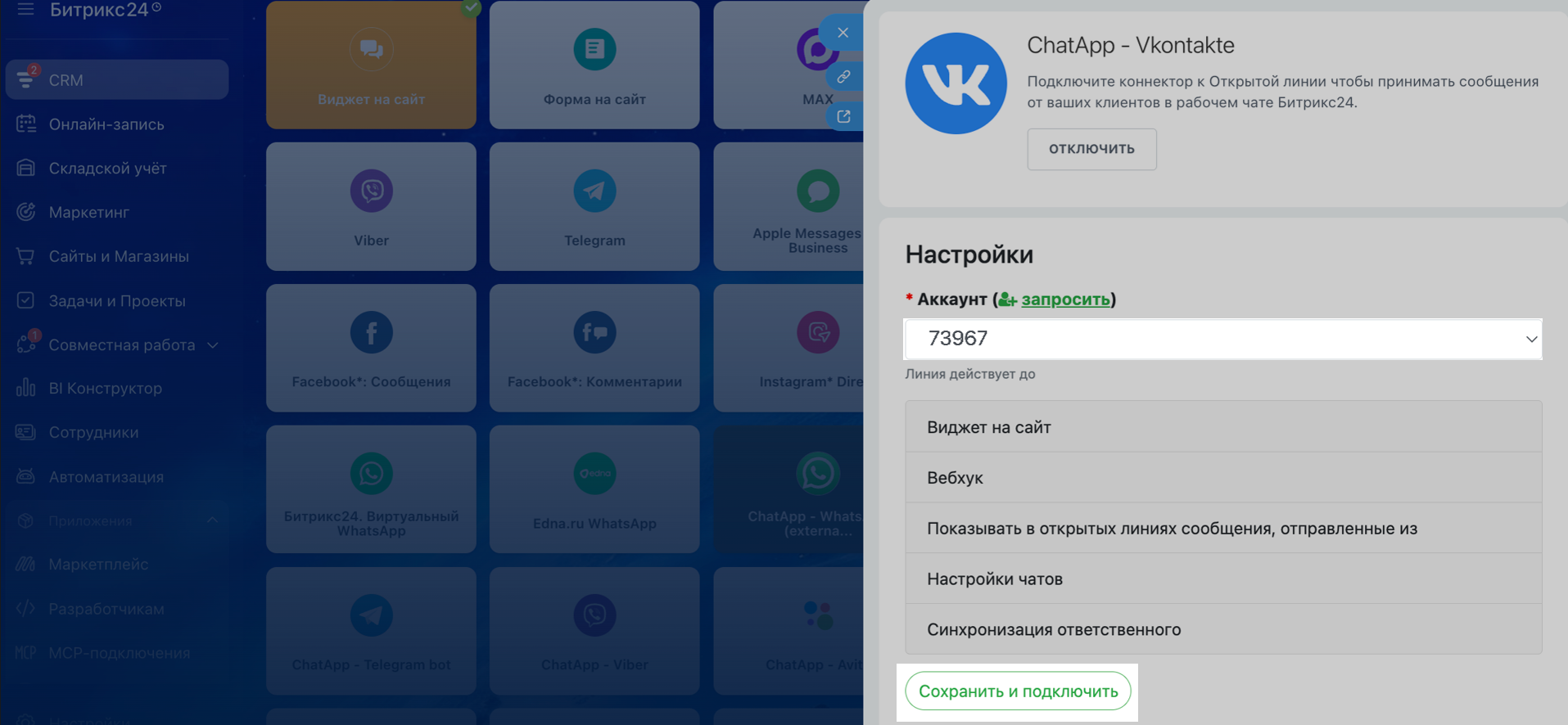 3. Нажмите «Сохранить и подключить». Готово — ВКонтакте добавлен.