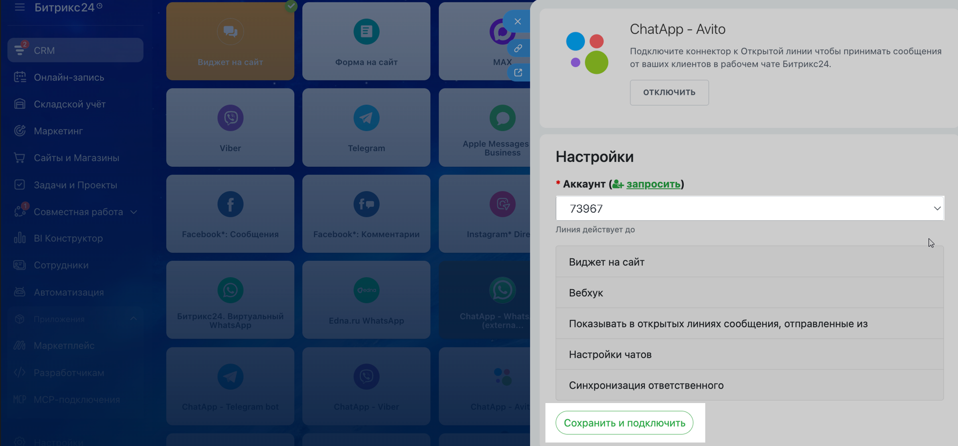 3. Нажмите «Сохранить и подключить». Готово — Авито добавлен.