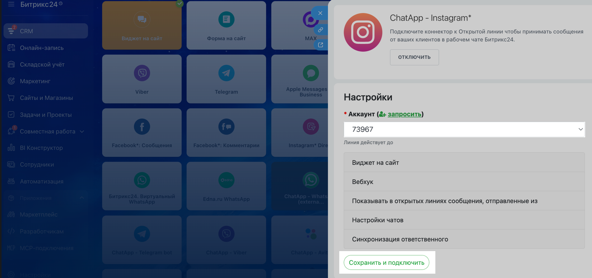 3. Нажмите «Сохранить и подключить». Готово — Instagram* добавлен.