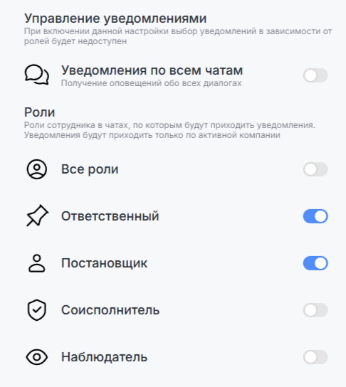 При первом включении уведомлений по умолчанию используется настройка по ролям. Настройка «Уведомления по всем чатам» не активируется автоматически и может быть включена вручную.