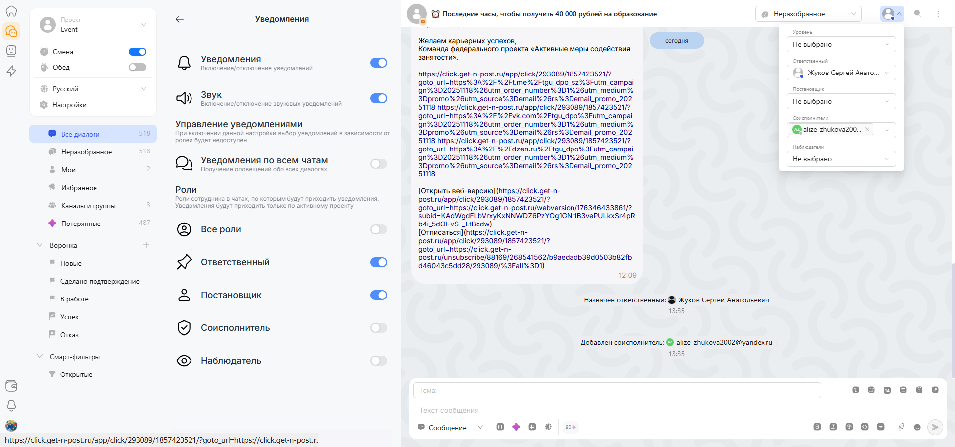 Например, при выборе роли «Ответственный» уведомления будут приходить по тем чатам, где эта роль установлена. Чтобы установить роль сотрудника в диалоге: