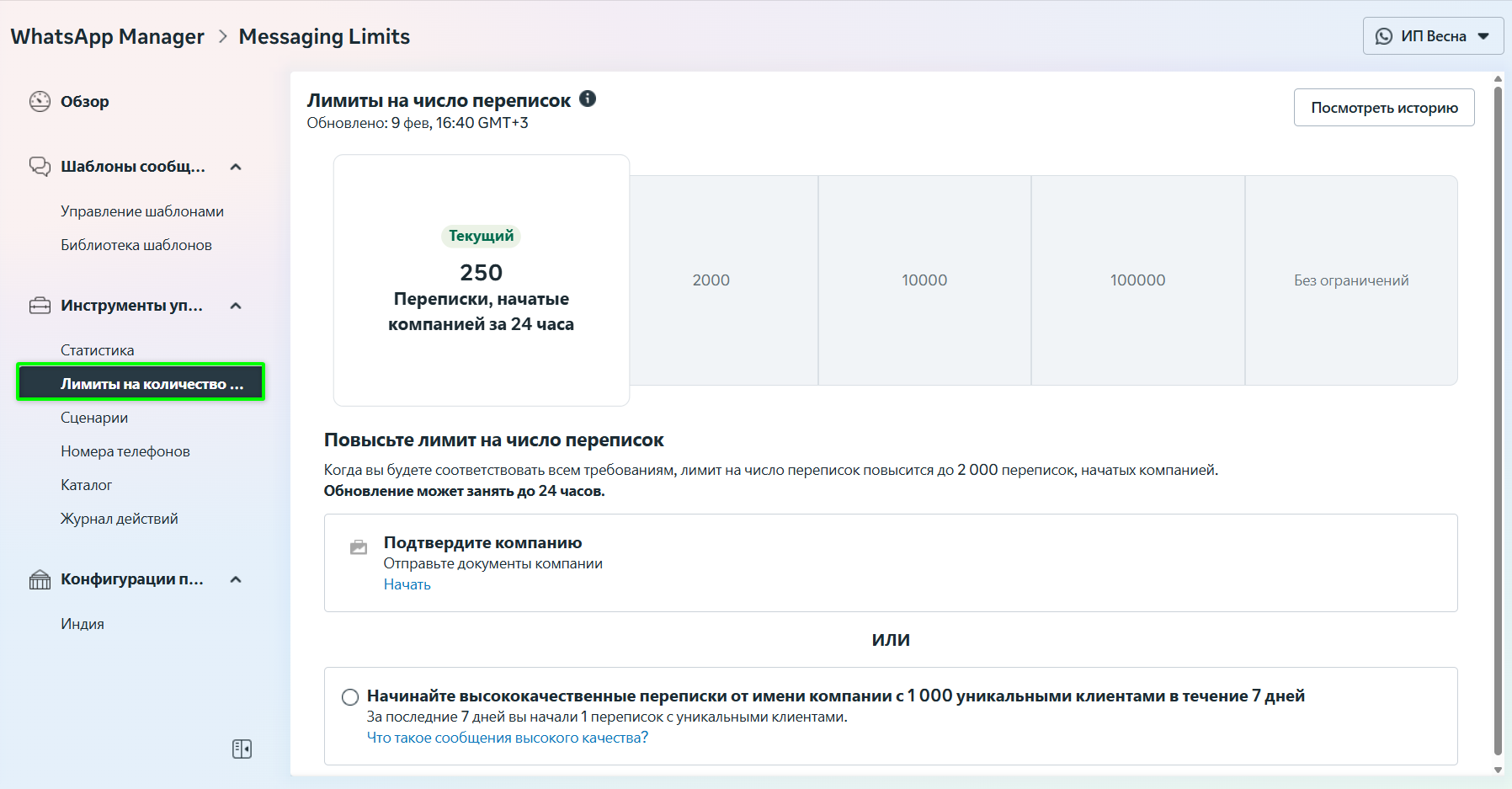 В разделе «Лимиты на количество сообщений» отображается максимальное число диалогов, которые можно инициировать в сутки.