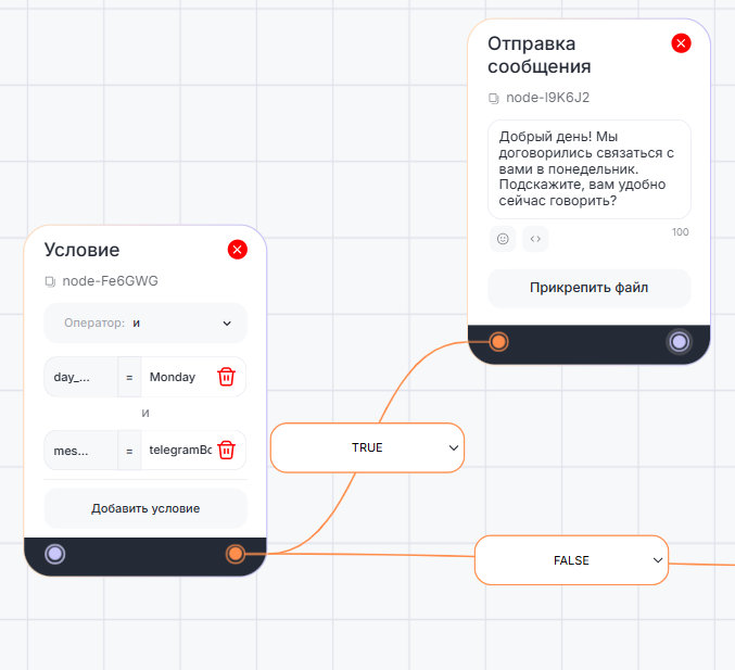 Блок «Условие» используется для создания различных веток сценария в зависимости от заданных параметров.