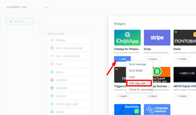 Salesbot amoCRM позволяет устанавливать метки диалогов в ChatApp Dialog.