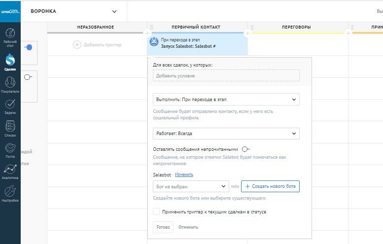 1. Выберите воронку и нажмите на кнопку «Настройки». Затем добавьте триггер и выберите «Salesbot».