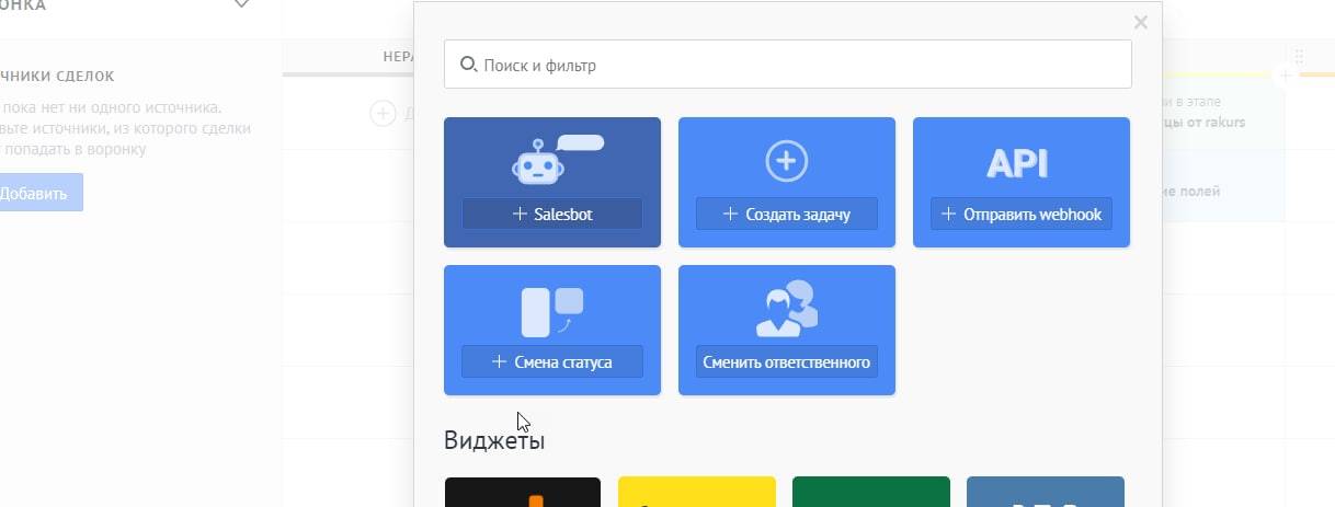 3. В визуальном редакторе после этапа «Start bot» выберите этап «Виджеты»
