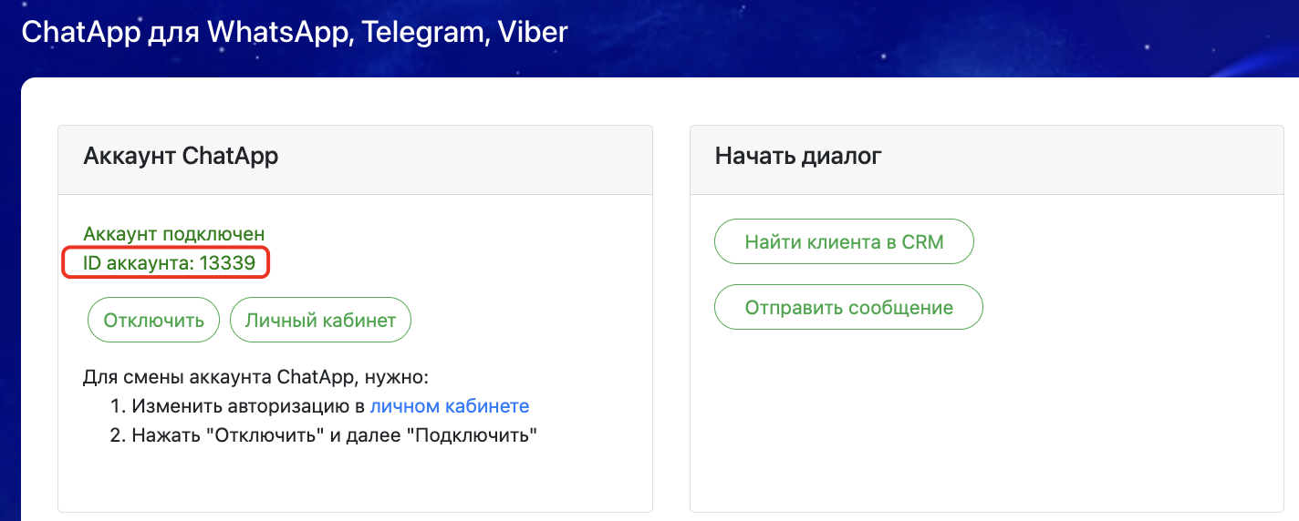 (если у вас авторизован личный кабинет ChatApp в браузере, подключение произойдёт автоматически).