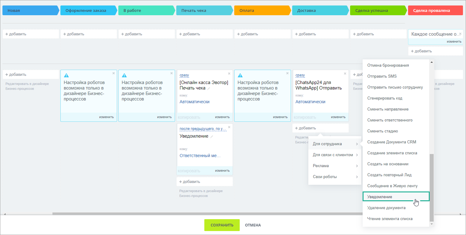 - Под роботом ChatApp нажмите на кнопку Добавить и в появившемся списке последовательно выберите Для сотрудника → Уведомление.
