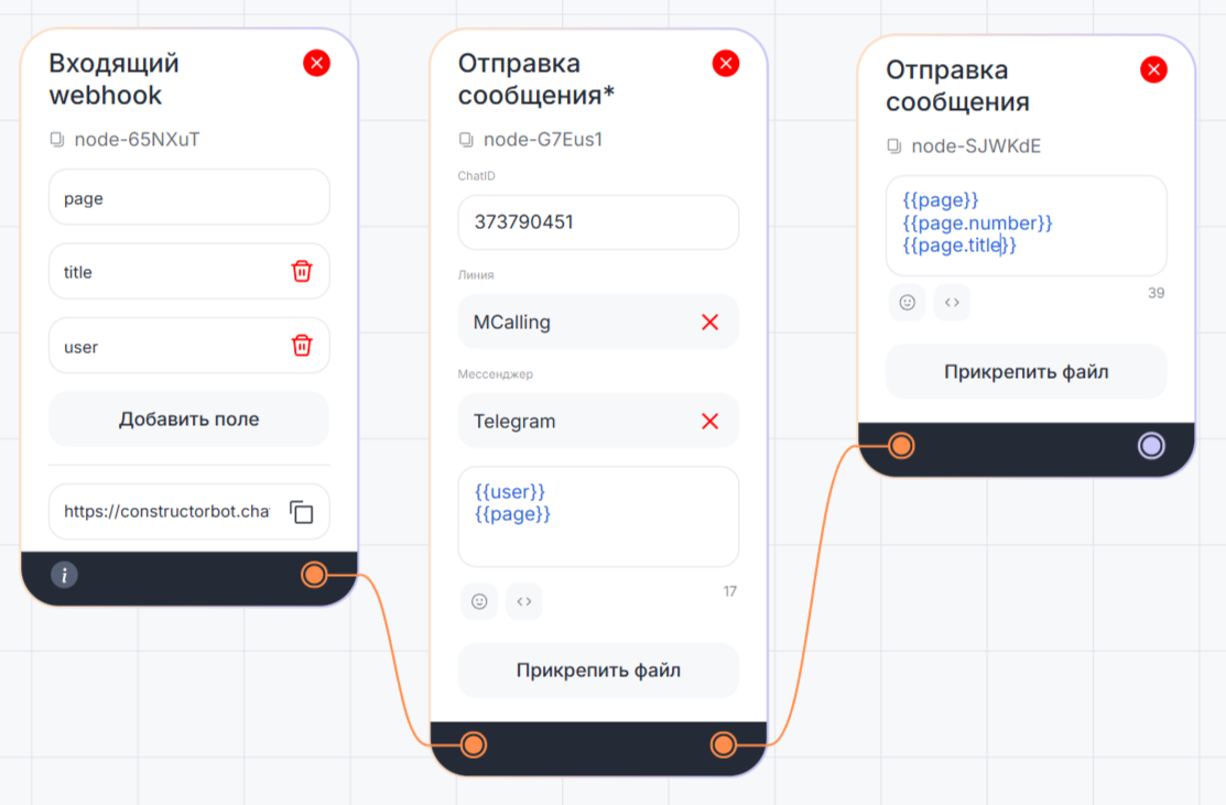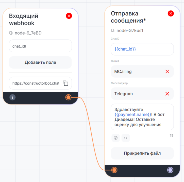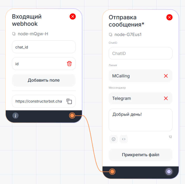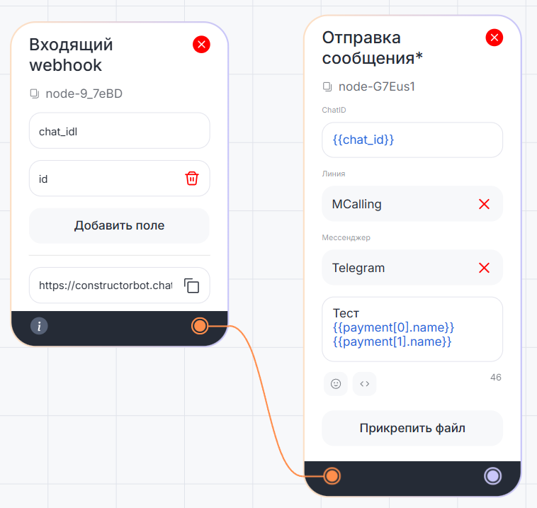 3. Создайте поля и впишите в них параметры, которые нужно передать. Например, параметры chat_id — телефон клиента и id — идентификатор карточки. Автоматически создаются локальные переменные с такими же названиями.