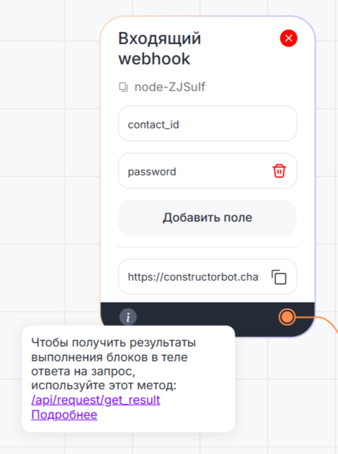С помощью блока «Входящий вебхук» также можно вернуть результаты работы блоков в теле ответа на запрос. Чтобы блок присылал ответ, нажмите на значок подсказки i в левом нижнем углу блока, скопируйте ссылку и используйте в нужном сервисе вместо стандартной ссылки запроса.