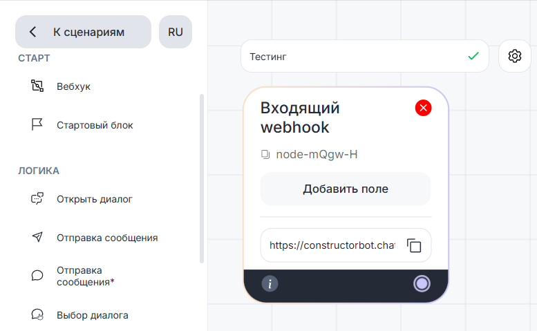 Запрос — специальная сгенерированная системой ссылка внизу блока. Она нужна для вызова сценария принятия запроса из сторонних сервисов. Это и есть вебхук, который используется для передачи данных в ChatApp.