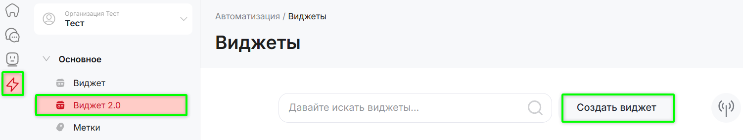 - Выберите пункт «Виджет 2.0» в левом меню.