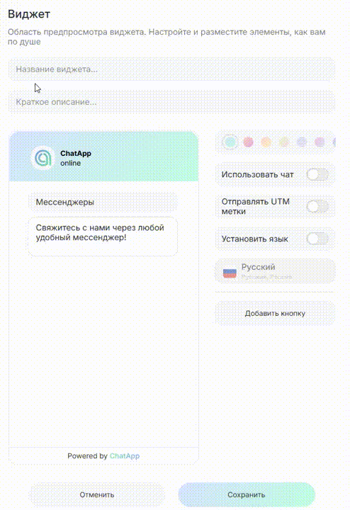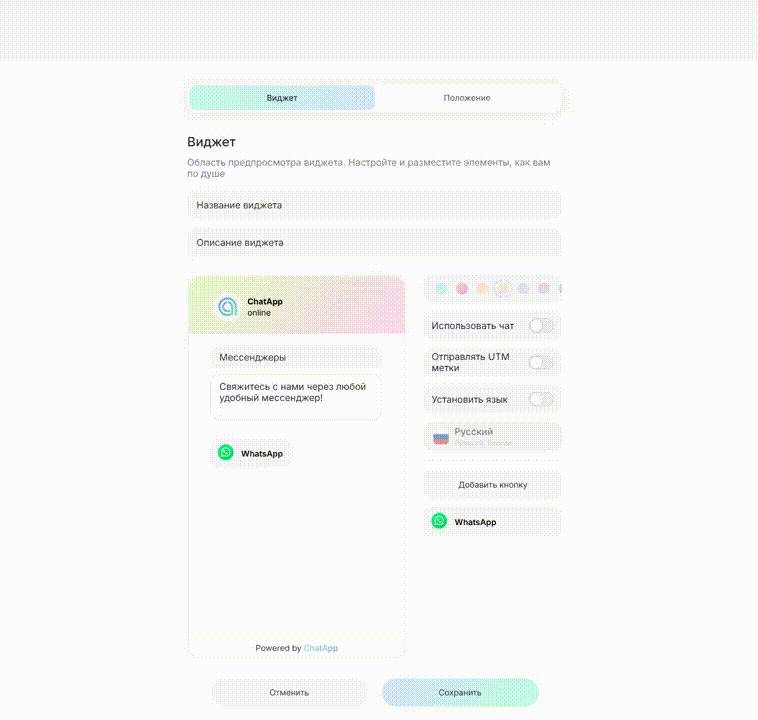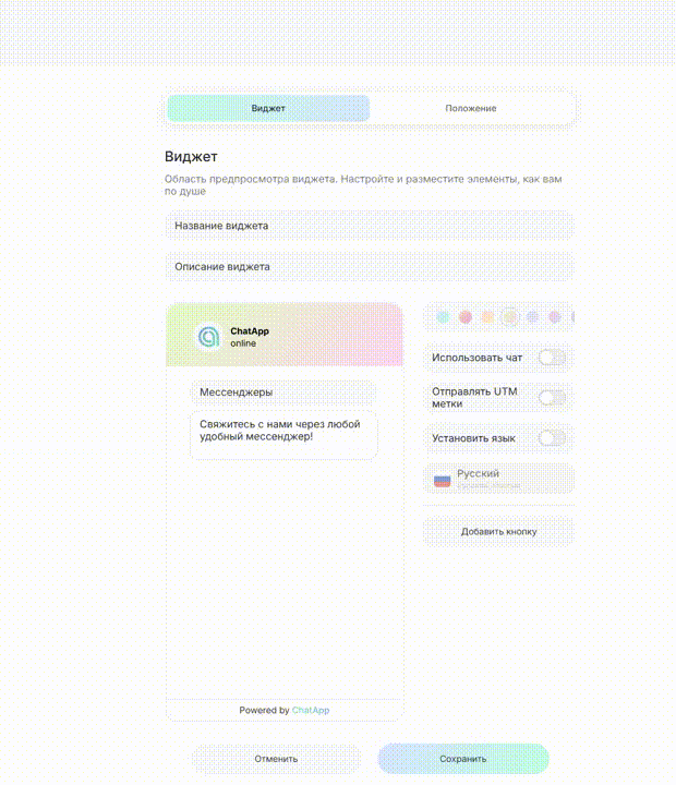 Данные отображаются только в списке виджетов и не влияют на его работу. - Активируйте параметр «Отправлять UTM метки», если требуется передача меток в личный кабинет или CRM.