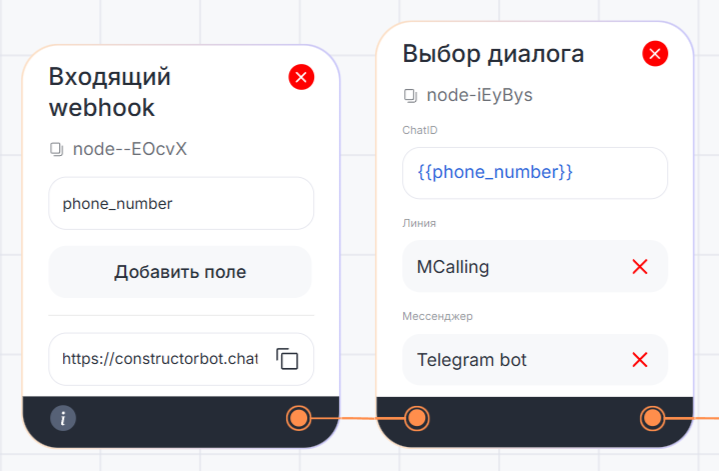 В сценарии с входящим вебхуком блок «Выбор диалога» используется, если нужно найти существующий чат клиента по номеру телефона, переданному через параметры вебхука.