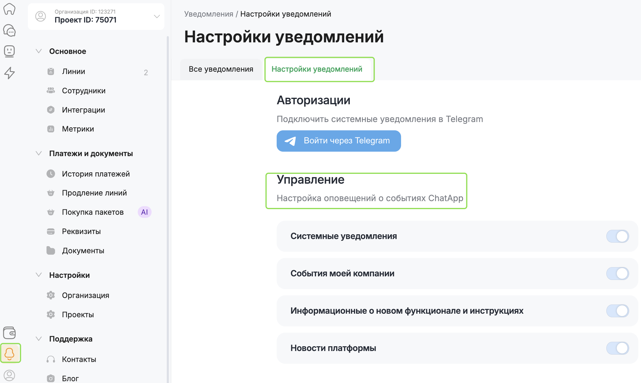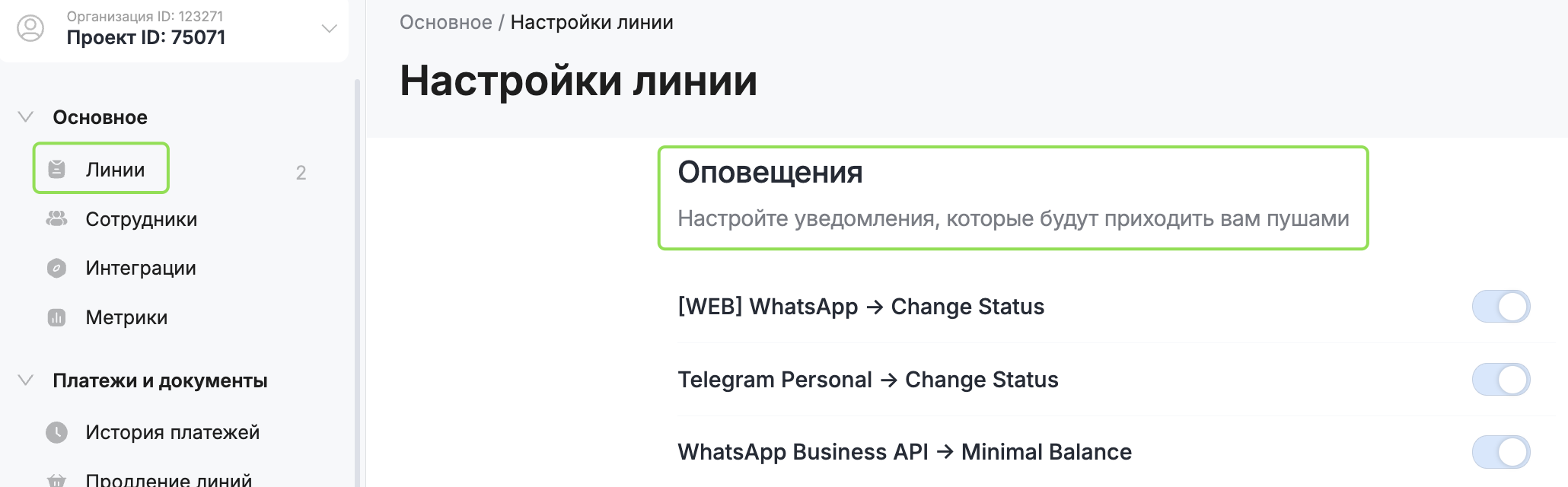Подключите Telegram-уведомления для получения уведомлений о действиях по конкретным линиям. В мессенджер поступают уведомления о завершении срока действия линии, изменении статуса канала (авторизация/разавторизация), предупреждении за 7 дней о завершении линии и архивировании линии.