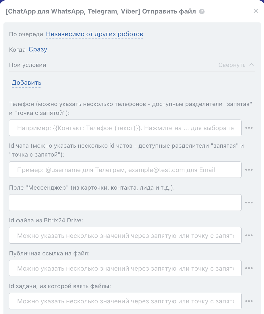 Робот может отправлять сообщение с файлом по номеру телефона, username, chat ID или через поле «Мессенджер».