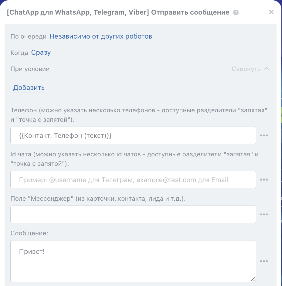 Робот может отправлять сообщение по номеру телефона, username, chat ID или через поле «Мессенджер».