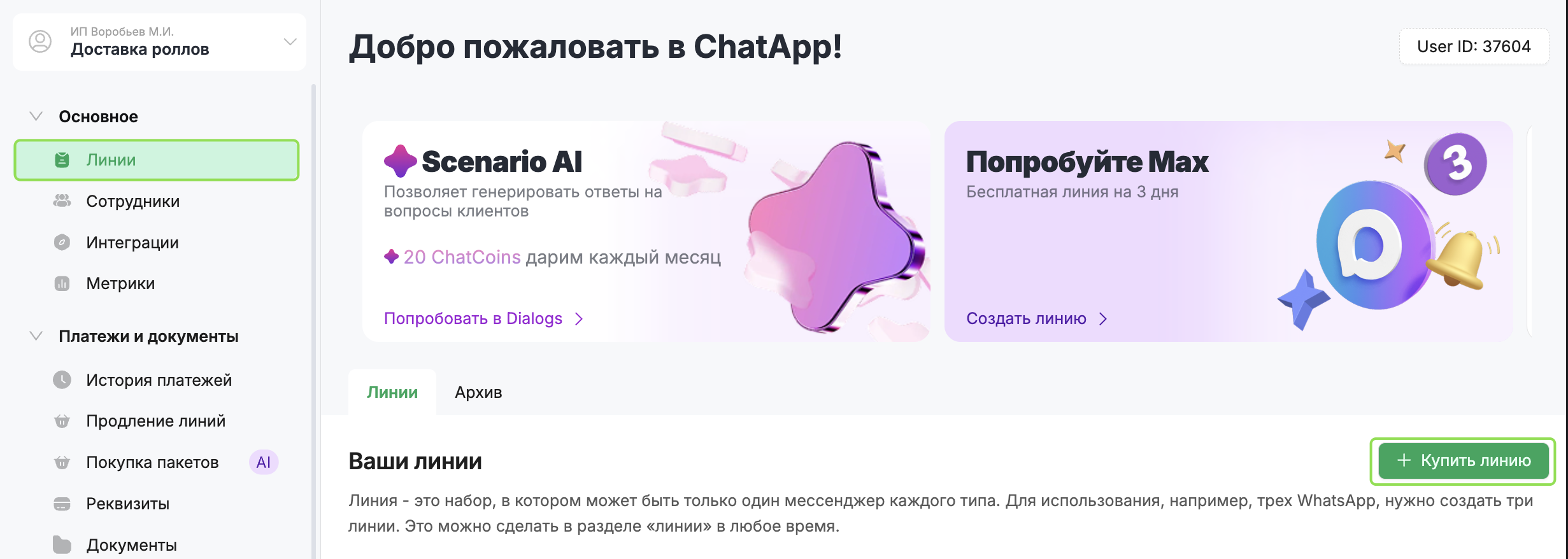 Шаг 1. Откройте раздел «Линии» и нажмите «Купить линию».