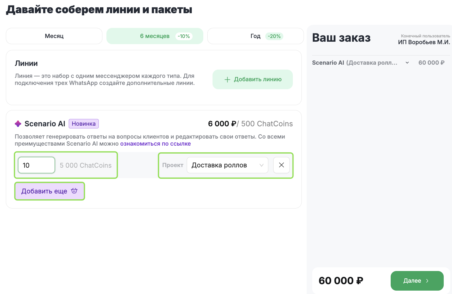 Шаг 4. Выберите период действия ChatCoins — 1, 6 или 12 месяцев, нажмите «Далее» и выберите способ оплаты.