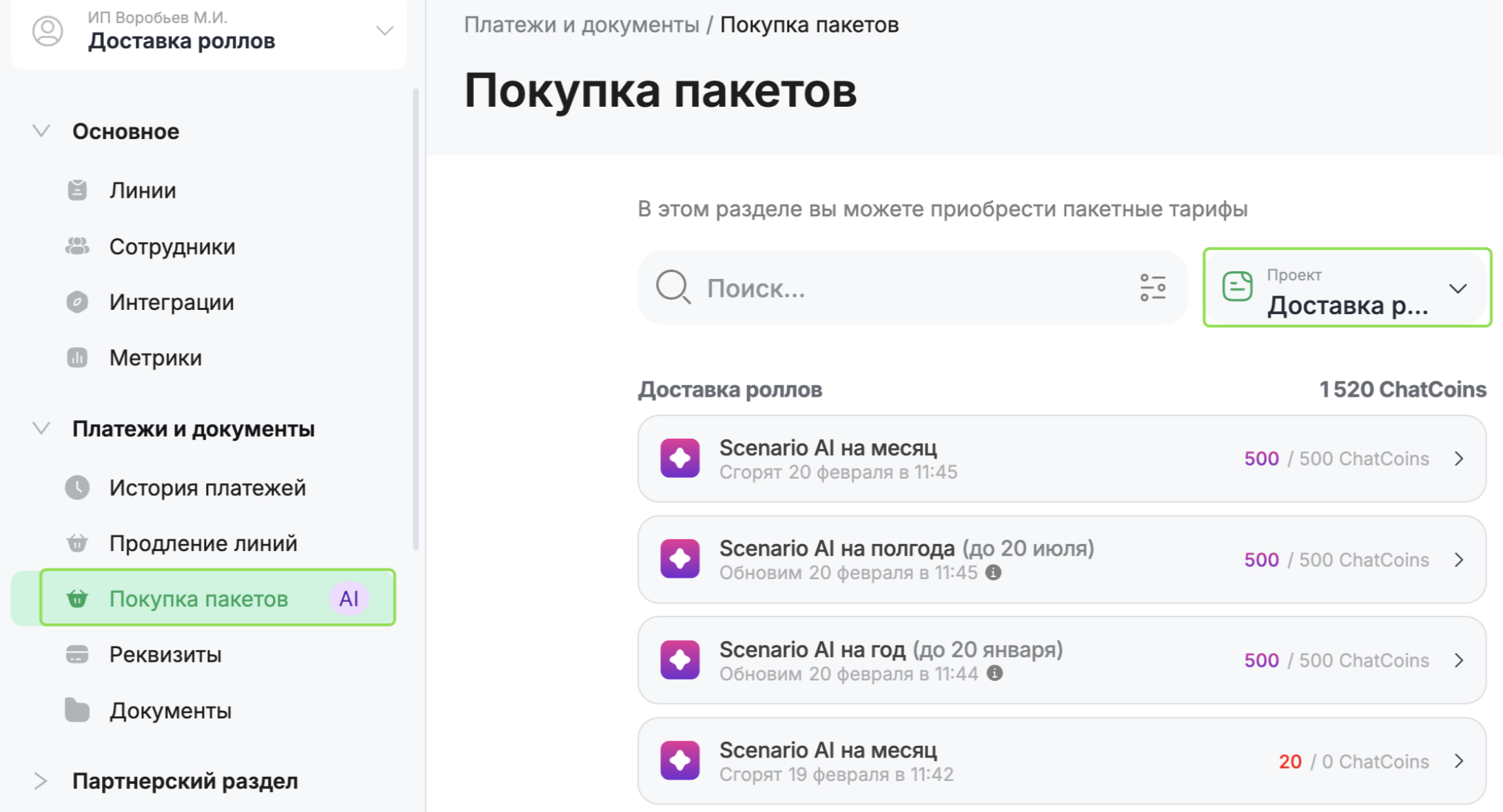 История покупок пакетов ChatCoins доступна в разделе «Платежи и документы» → «Покупка пакетов». В разделе можно отфильтровать платежи по проектам просмотреть: