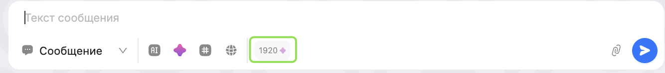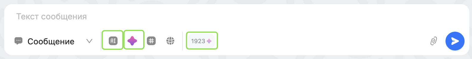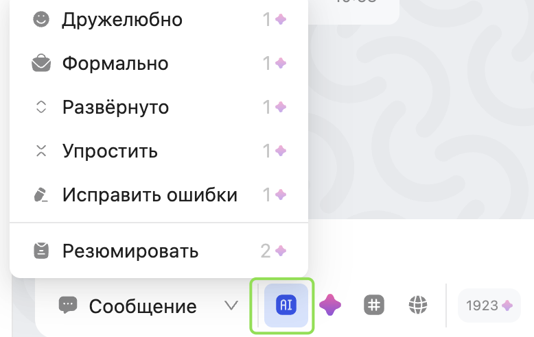Кнопка AI — кнопка позволяет изменить текст, введённый в поле ввода сообщения: перефразировать его, выбрать более дружелюбный или формальный стиль, сделать ответ более лаконичным или, наоборот, более развёрнутым, или резюмировать диалог.