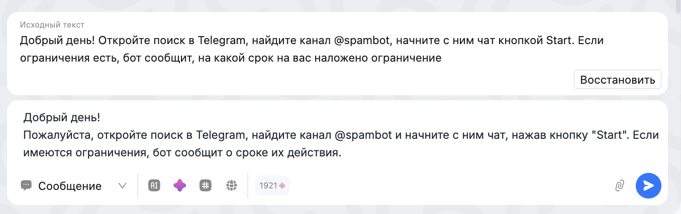 После выполнения действия ассистент показывает исходный текст и вариант, предложенный ассистентом. Вы можете сравнить их, при необходимости отредактировать текст перед отправкой клиенту.