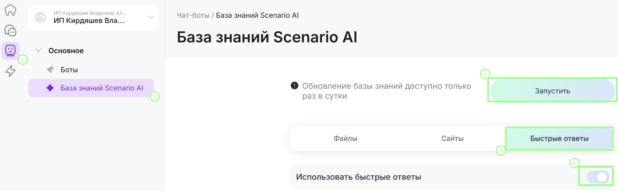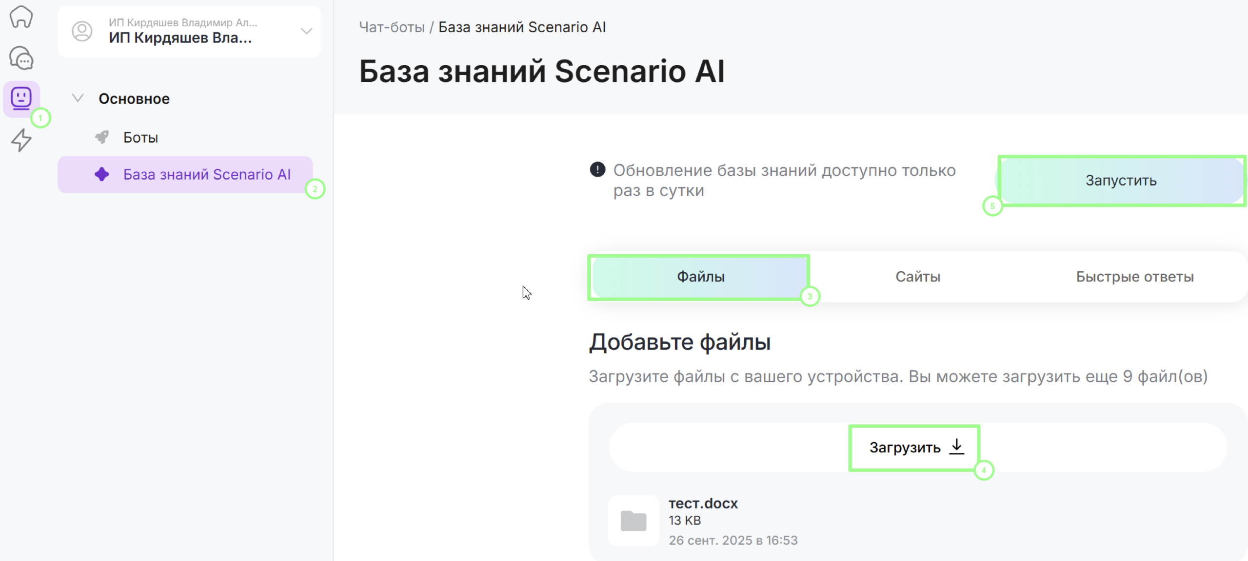 Обучение выполняется в личном кабинете в разделе Чат-боты → База знаний Scenario AI.