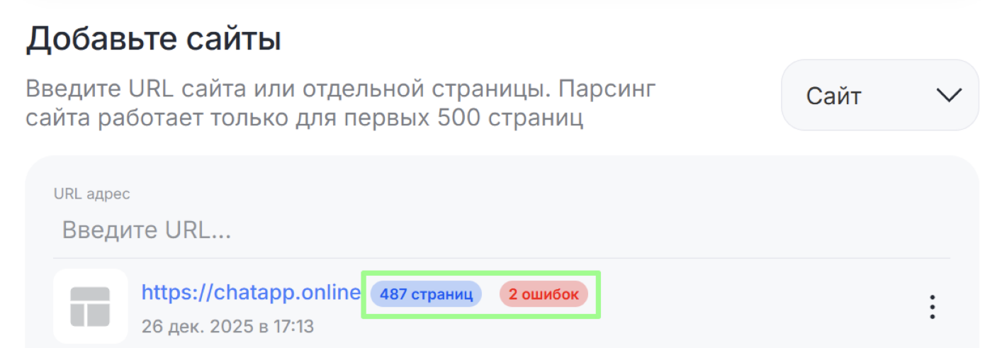 После завершения обучения отображаются: количество обработанных страниц; список страниц, которые не удалось обработать (если такие есть).