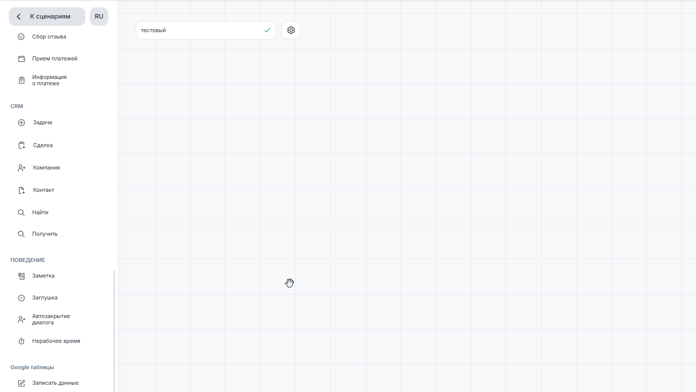 - Добавьте блок «Создать сделку CRM» в рабочую область