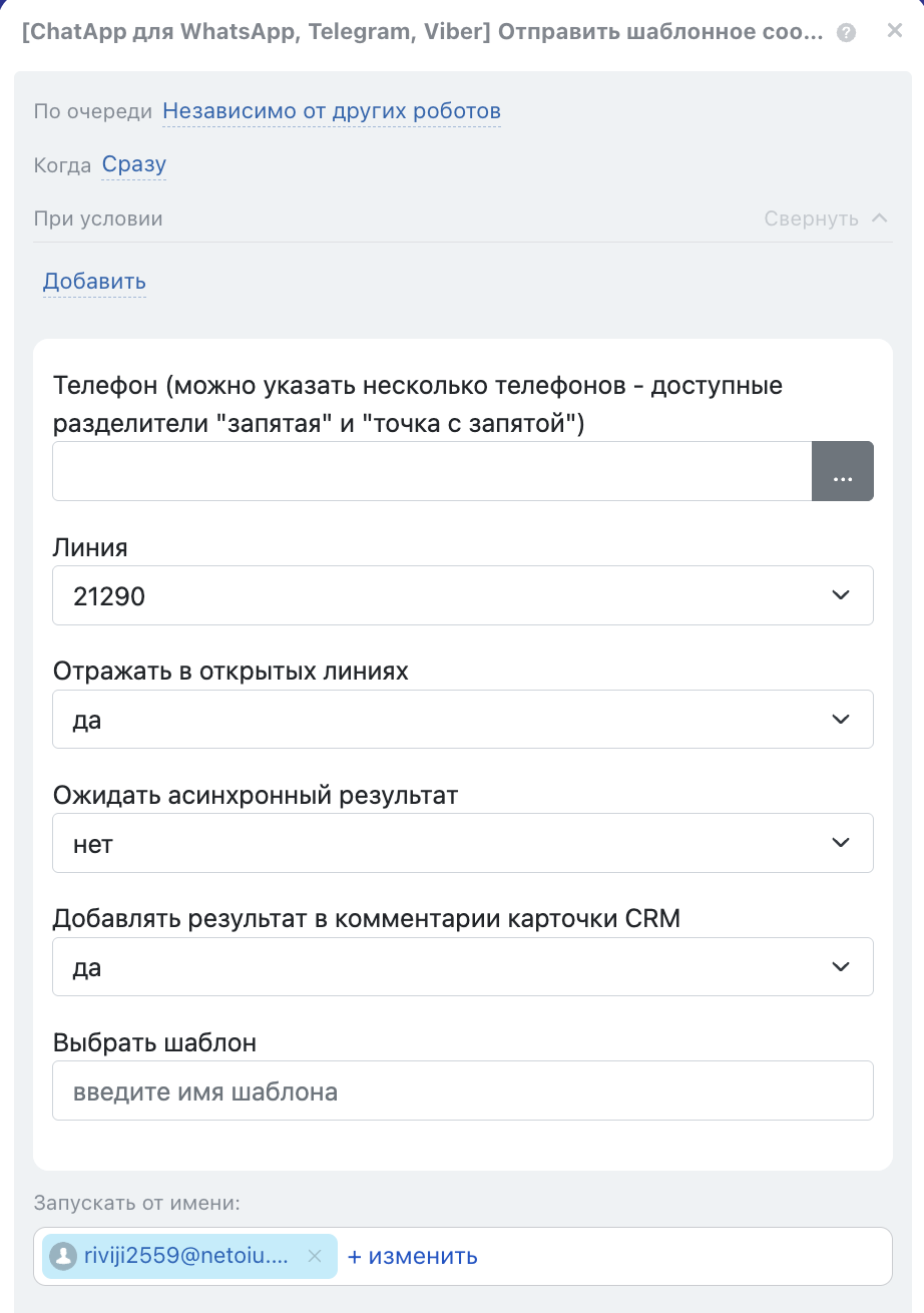 Шаг 4. Выберите робота [ChatApp для WhatsApp, Telegram, Viber] — «Отправить шаблонное сообщение WACA».