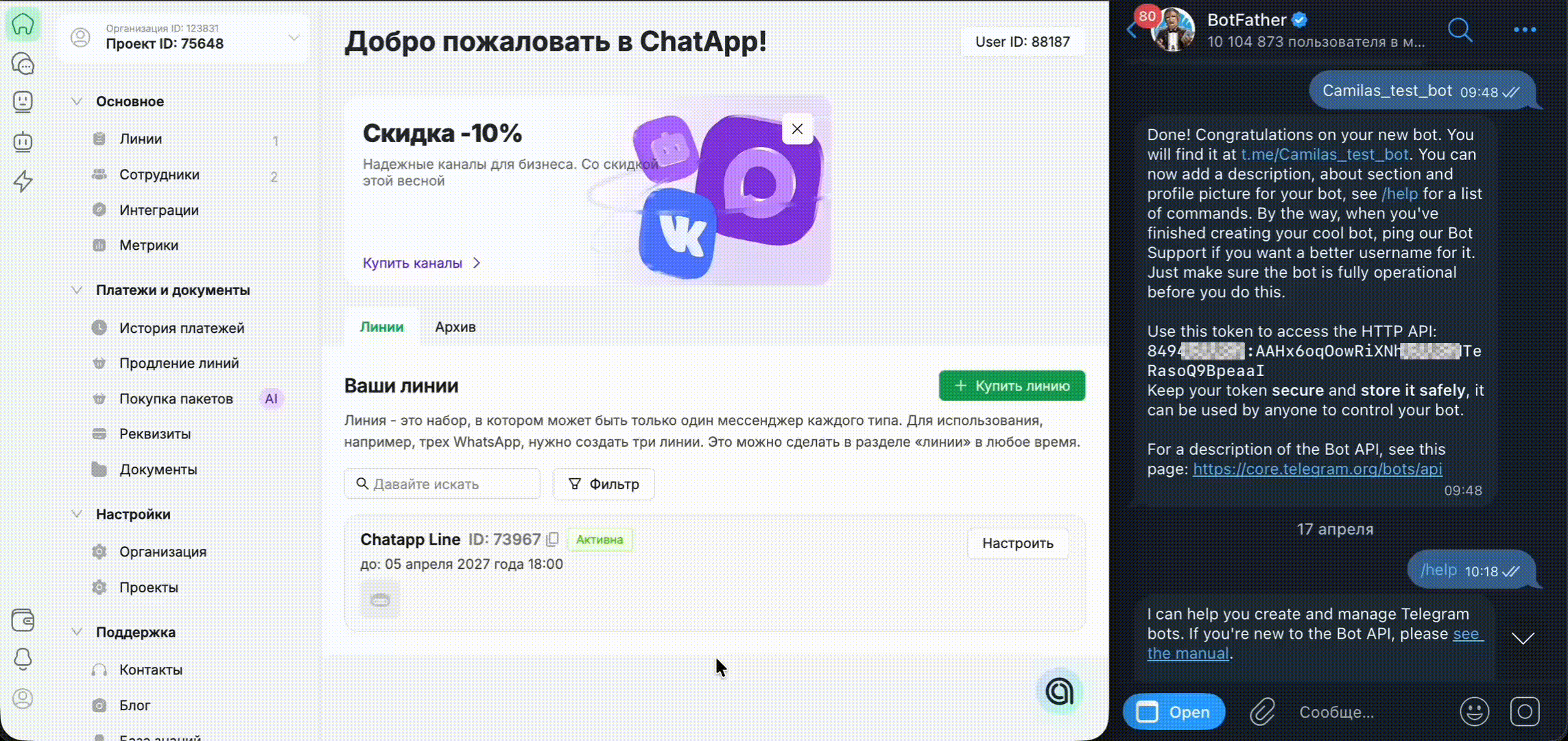 В ChatApp можно подключить Telegram Bot от бизнес-аккаунта Telegram. Перед подключением убедитесь, что в личном кабинете уже подключена линия с Telegram Bot.