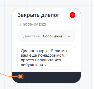 Этот блок закрывает диалог и перезапускает сценарий. Это значит, что если клиент напишет в чат после того, как сработал блок «Закрыть диалог», бот начнет разговор заново, со стартового блока.