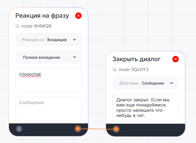 В редакторе сценариев есть два блока, которые закрывают диалог. Они необходимы, чтобы бот менял статус диалога в Scenario Dialogs с «Открыт» на «Закрыт» по команде или автоматически.