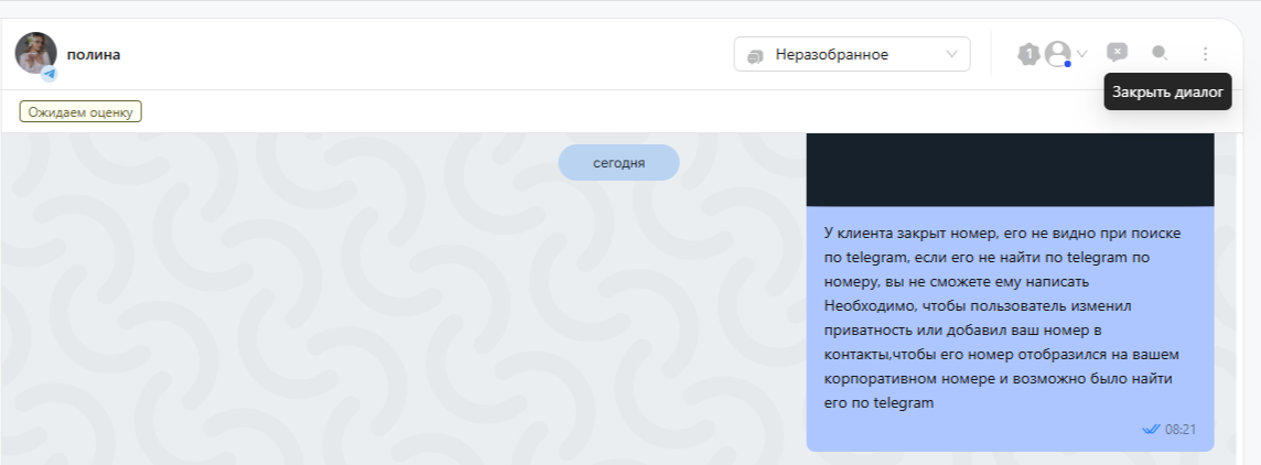 Теперь диалог закроется, когда оператор отправит в чат команду /closechat.