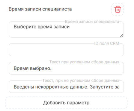 - Добавьте параметр «Время записи специалиста» — напишите фразу, она будет отображаться в боте, когда клиент выбирает время записи, например: «Выберите время записи»;
