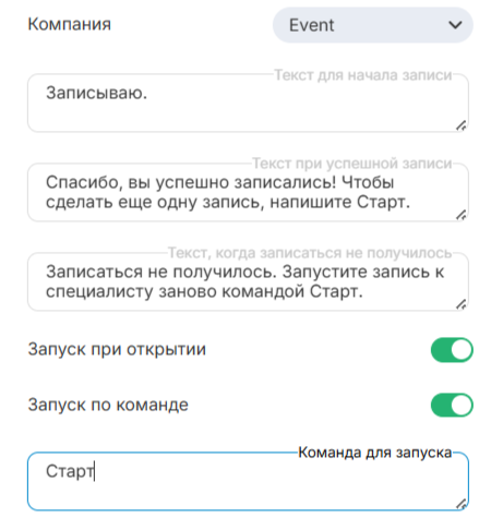 - В окне «Текст, когда записаться не получилось», напишите, что у клиента не получилось записаться, и подскажите ему. как начать процесс записи заново. Например: «Записаться не получилось. Запустите запись к специалисту заново командой Старт»;