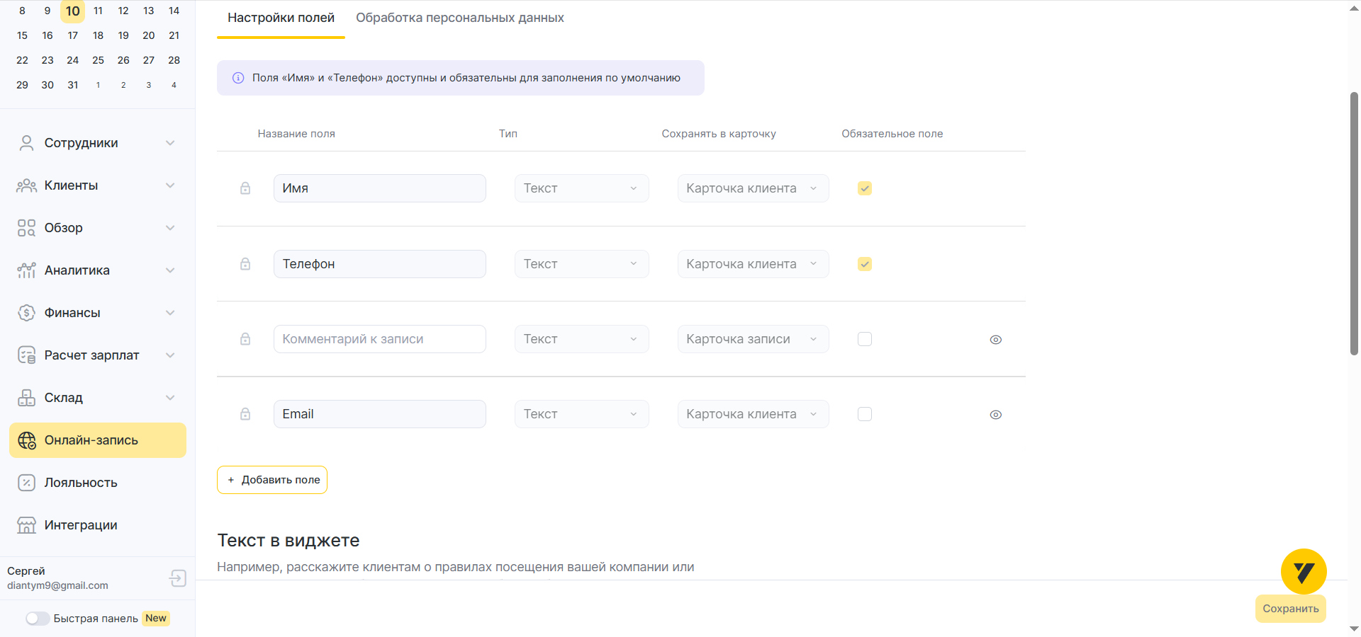 Если бот не запрашивает почту клиента, то в кабинете Yclients нужно снять галочку: «Онлайн-запись» -> Функциональность -> Измените экран ввода данных клиента -> Настройки полей -> Email.