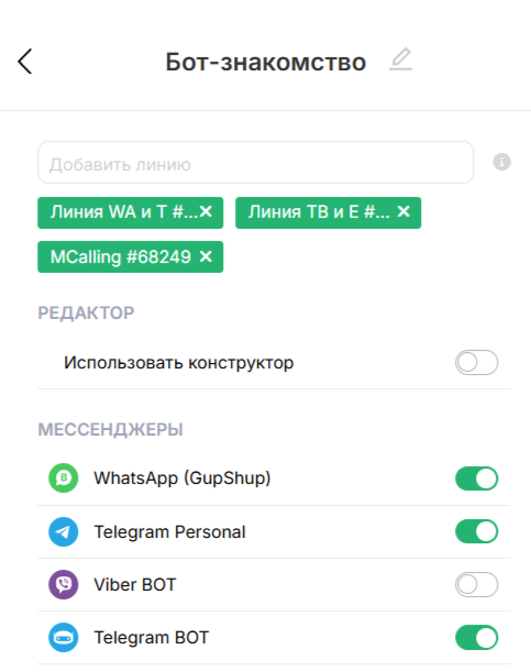 4. Выберите, в каких линиях будет работать бот. Убедитесь, что к ним привязаны выбранные мессенджеры: