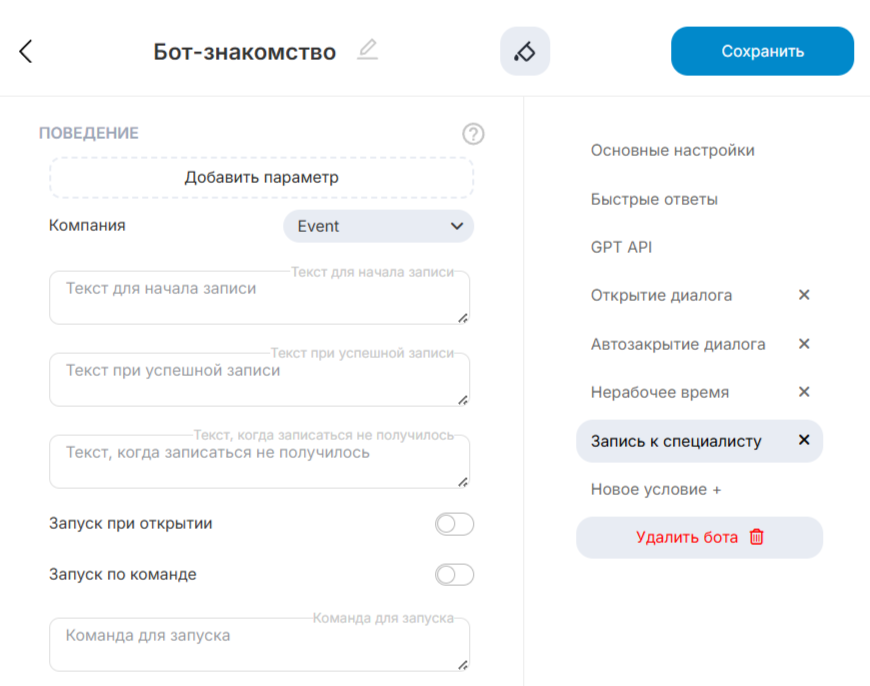 В Конструкторе ботов реализован функционал записи к специалисту с настройкой быстрых ответов бота, при успешной или не успешной записи. Например, если компания занимается консультированием клиентов, можно настроить бота так, чтобы клиент мог выбрать одного из специалистов из списка и назначить онлайн встречу.