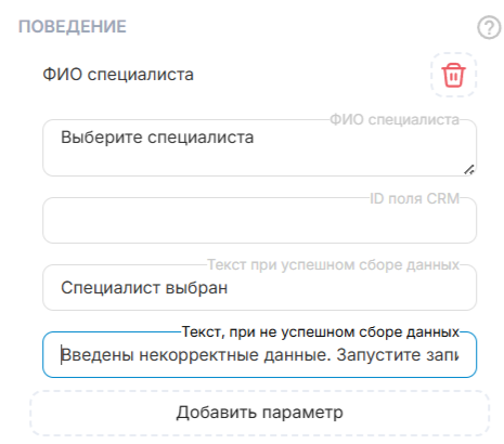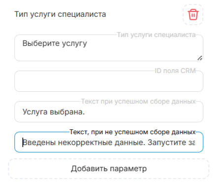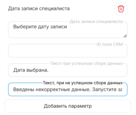 Для всех параметров заполните поля «Текст при успешном сборе данных» и «Текст при не успешном сборе данных». Этот текст получит в сообщении клиент в зависимости от результата сбора.
