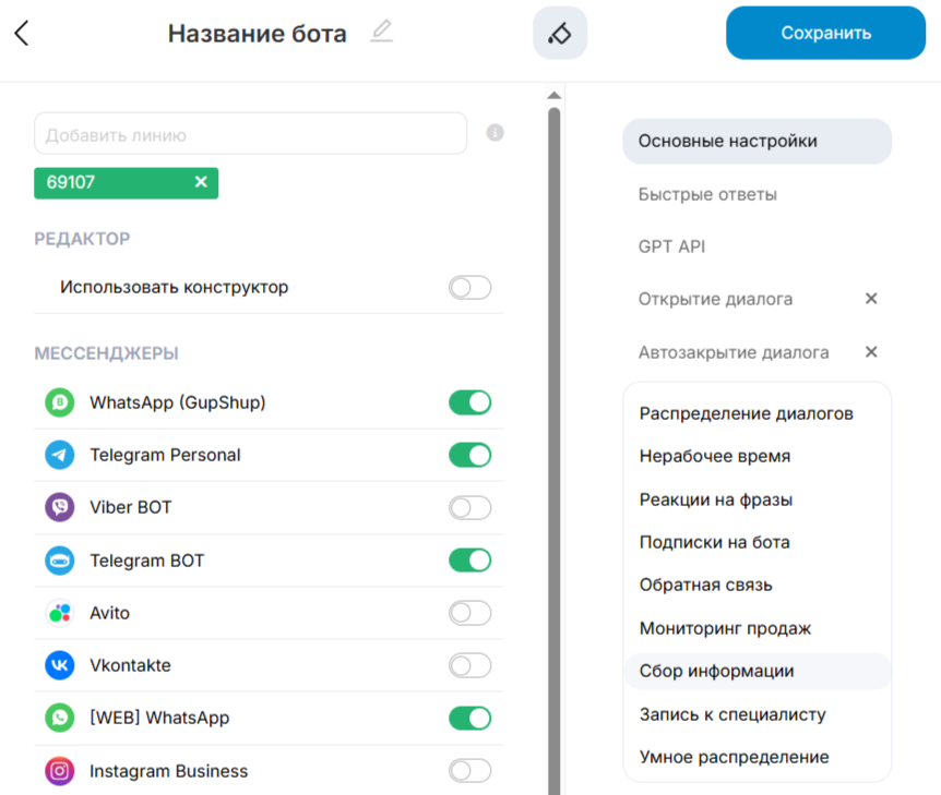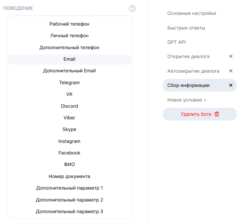 С помощью бота система может запрашивать дополнительную информацию у клиента. Для этого в основных настройках бота перейдите в раздел «Сбор информации» и настройте его для сбора пользовательских данных.
