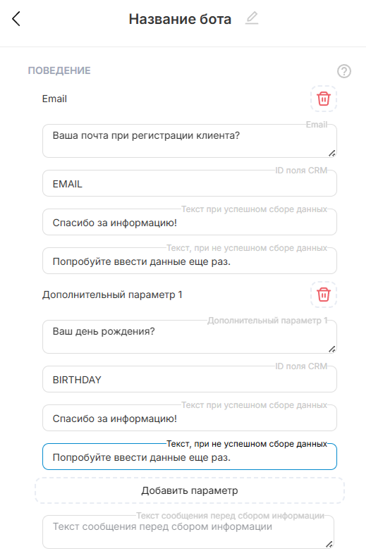 2. Добавить в запрос дополнительный параметр пользователя, например, день рождения. Для этого нажмите на «Добавить параметр» и заполните поля поведения бота.